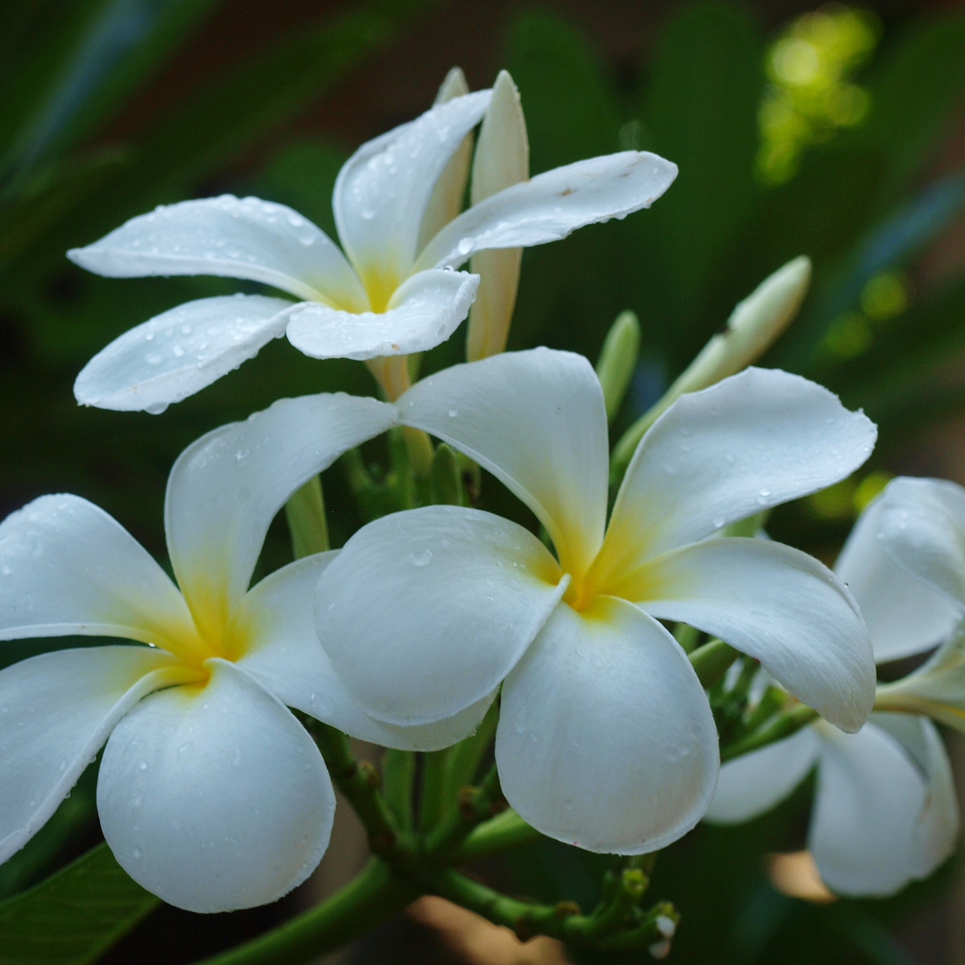 Com pétalas suaves e perfume marcante, a frangipani floresce durante todo o ano no clima tropical.